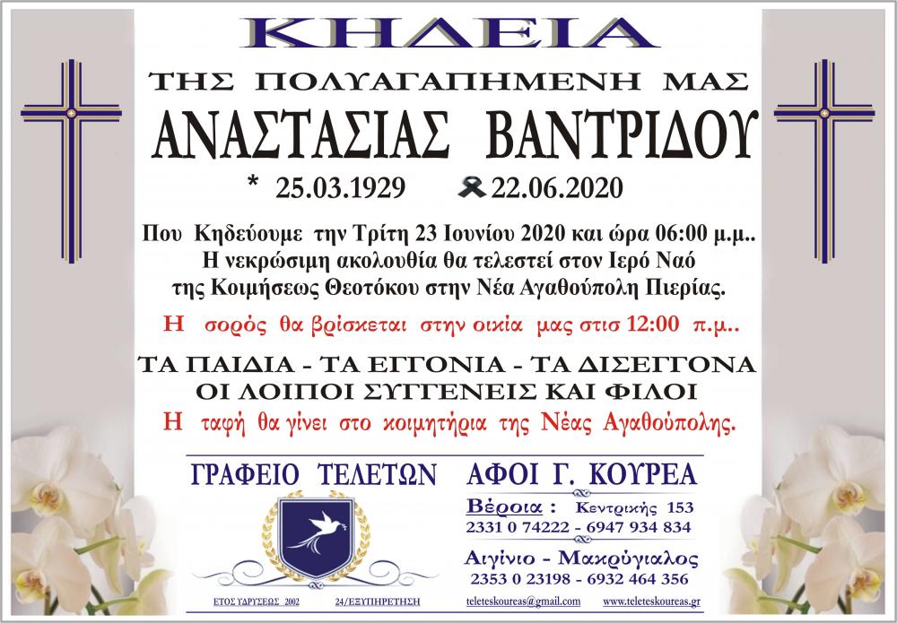 Η κηδεία της αναστασίας φασούλα θα τελεστεί αύριο τετάρτη 7 νοεμβρίου, στον ιερό ναό ευαγγελιστρίας αλμυρού και ώρα 11:00 π.μ.η σορός θα βρίσκεται στον ναό ώρα 10:00 π.μ.